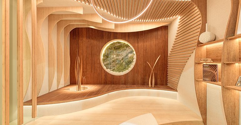 Para la arquitectura interior del espacio AlterEspacio ha tomado como punto de partida la sección del bambú en forma redonda “O” con la que se crea un gran círculo que invita al visitante a sentarse y descubrir el espacio, que se traza con varios niveles de formas orgánicas, que recuerdan tanto la flexibilidad del tallo del bambú, como sus hojas lanceoladas reproducidas, por ejemplo, en el banco de entrada o mediante el reflejo del techo.