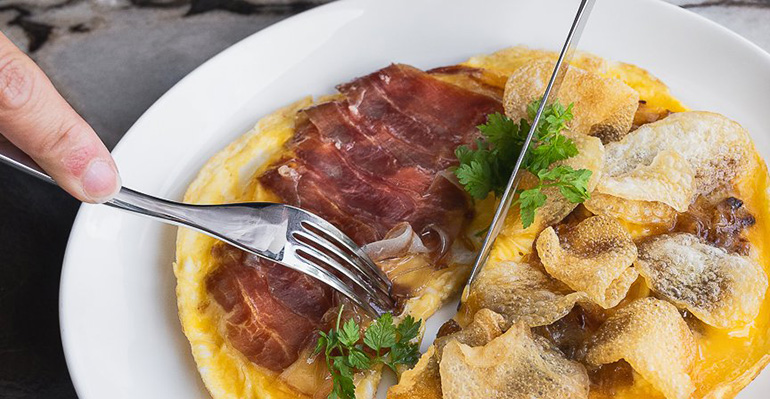 El restaurante abre ininterrumpidamente de 8:00 a 21:30 horas y acoge una gran variedad de propuestas que se dividen en platos para todo el día y una oferta específica para comidas y cenas. Sus desayunos, disponibles desde primera hora y durante toda la jornada, incluyen sándwiches variados –de ternera con queso fundido y pimientos verdes confitados, de jamón 5J con queso y trufa, de atún con tomate y berros…–, repostería casera –cruasán, Kouign Amann…– y postres típicos españoles como torrija al vino tinto con helado de queso o natillas, fruta fresca aliñada con menta, pimienta negra y AOVE y una buena variedad de huevos preparados de diferentes maneras: en tortilla con salmón curado al Pedro Ximénez, con patatas fritas, cebolla caramelizada y paleta ibérica 5J, al horno con pisto o rellenos de anchoas, de bacalao con azafrán o de sobrasada picante.