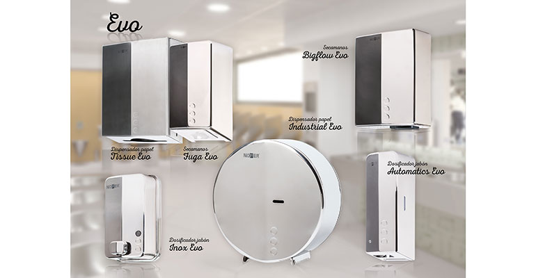 Esta línea de productos abarca desde secadores de manos hasta dispensadores de papel, jabón y porta rollos de papel; a los que se ha dotado de un diseño geométrico en dos caras, que le da un aspecto minimalista e innovador a estos equipos.