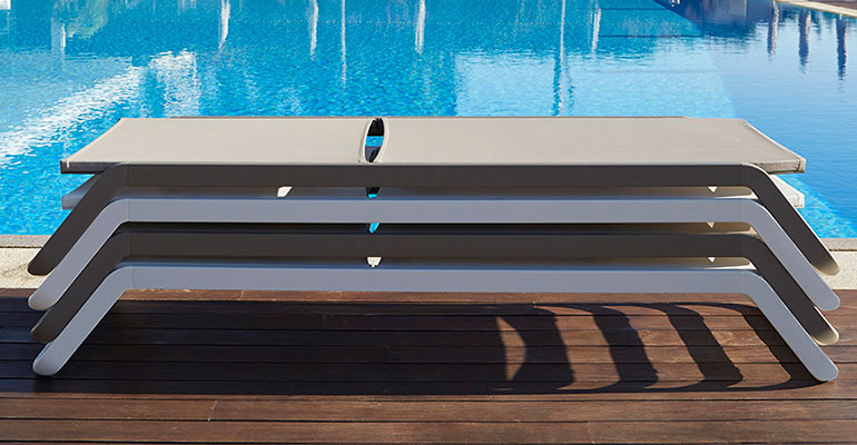 La robustez y facilidad de uso de la nueva tumbona de Ezpeleta contrasta con su estética limpia de líneas rectas. Vila está compuesta por una estructura de aluminio que le confiere resistencia sin restarle ligereza; un tejido de fácil mantenimiento con propiedades antibacterianas y resistente a la humedad, así como patas de polipropileno reforzado con sibra de vidrio, que asegura la durabilidad y permiten su uso sobre cualquier superficie, incluso agua o arena. Además, al estar compuesta en diferentes partes, es más fácil reponer las piezas.