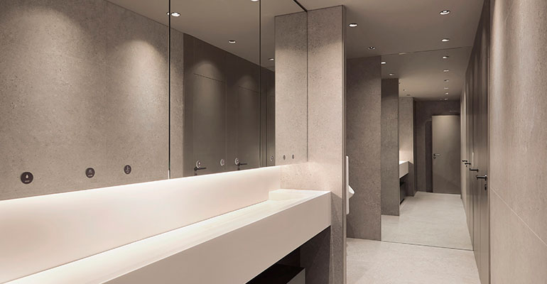El grupo recomienda su combinación con encimeras Solid Surface para conseguir espacios funcionales y únicos, como el del baño de las oficinas de Torre Diagona Mar 1 (en imágenes), un proyecto de Octavio Mestre y Coblonal.